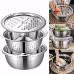 طقم من 3 قطع مكون من مصفاة ومبشرة ووعاء لغسل الخضراوات وأداة مطبخ من الستانلس ستيل لعجن العجين وخلط السلطة
