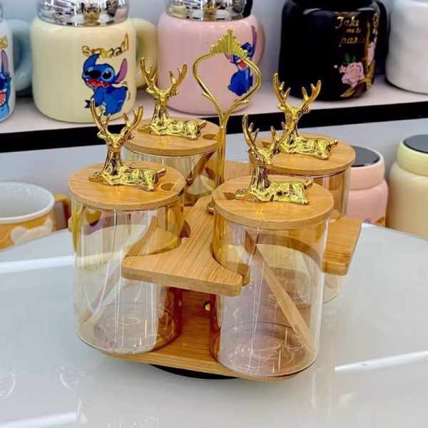 طقم توابل غزالة زجاج ٤ قطع على ستاند خشب