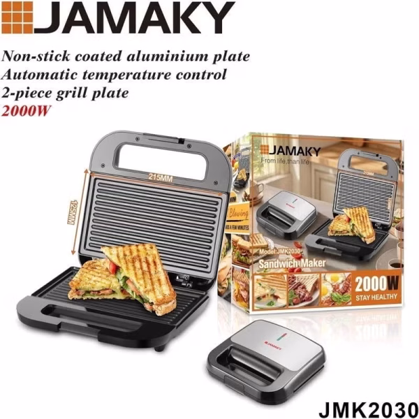صانعة الساندويتشات، من جاماكي 2000 وات، ألواح ألومنيوم غير لاصقة، وش استنلس عازل الحرارة تحكم تلقائي في درجة الحرارة، موديل JMK2030