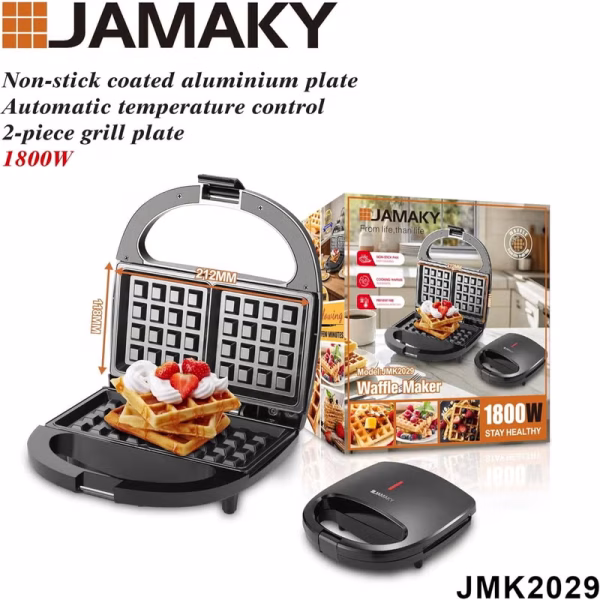 ماكينة صنع الوافل، 1800 واط، الواح الومنيوم غير لاصقة، تحكم تلقائي في درجة الحرارة، 2 طبق شواء، اسود JMK2029