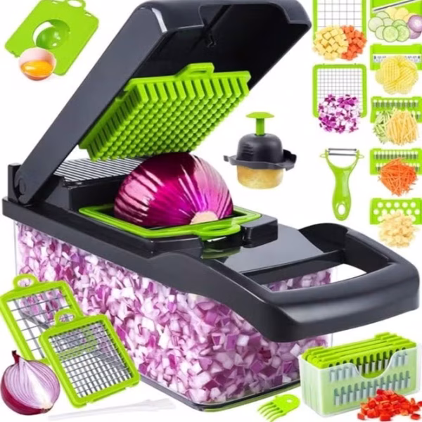 قطاعة خضروات وبصل احترافية متعددة الوظائف 16 في 1، قطاعة خضروات للمطبخ مع 8 شفرات، قطاعة جزر وثوم مع حاوية (رمادي)