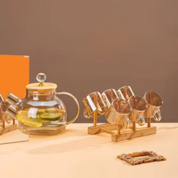 طقم من 7 قطع من إبريق شاي سعة 1 لتر و6 أكواب سعة 100مل وحامل خشب للاكواب بتصميم منقوش بالكريستال – عسلي